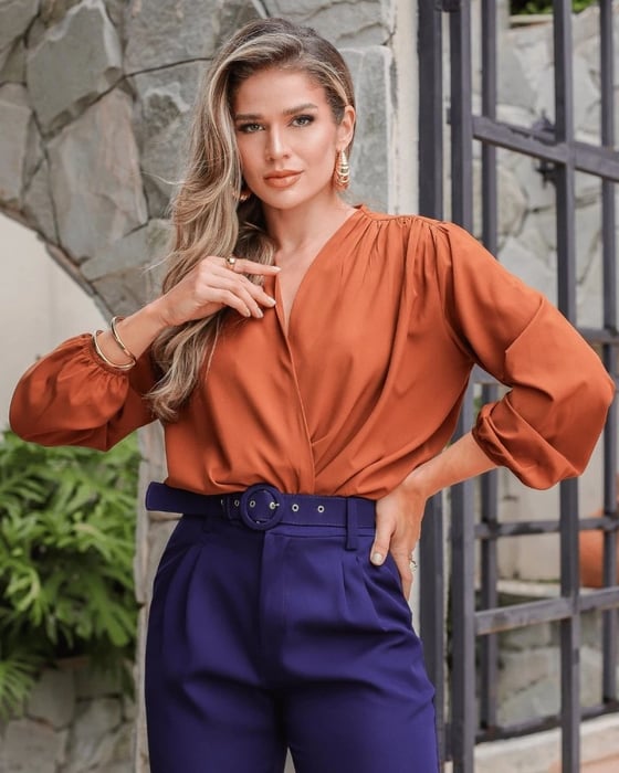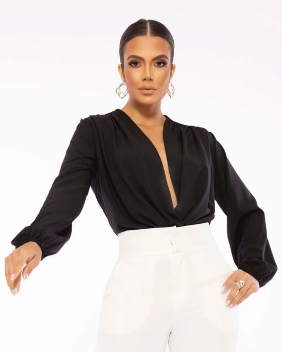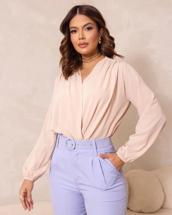 Blusa Eloise em tecido Silk Span, design sofisticado com decote em V profundo e mangas longas com punhos levemente franzidos, perfeita para quem busca elegância e conforto.